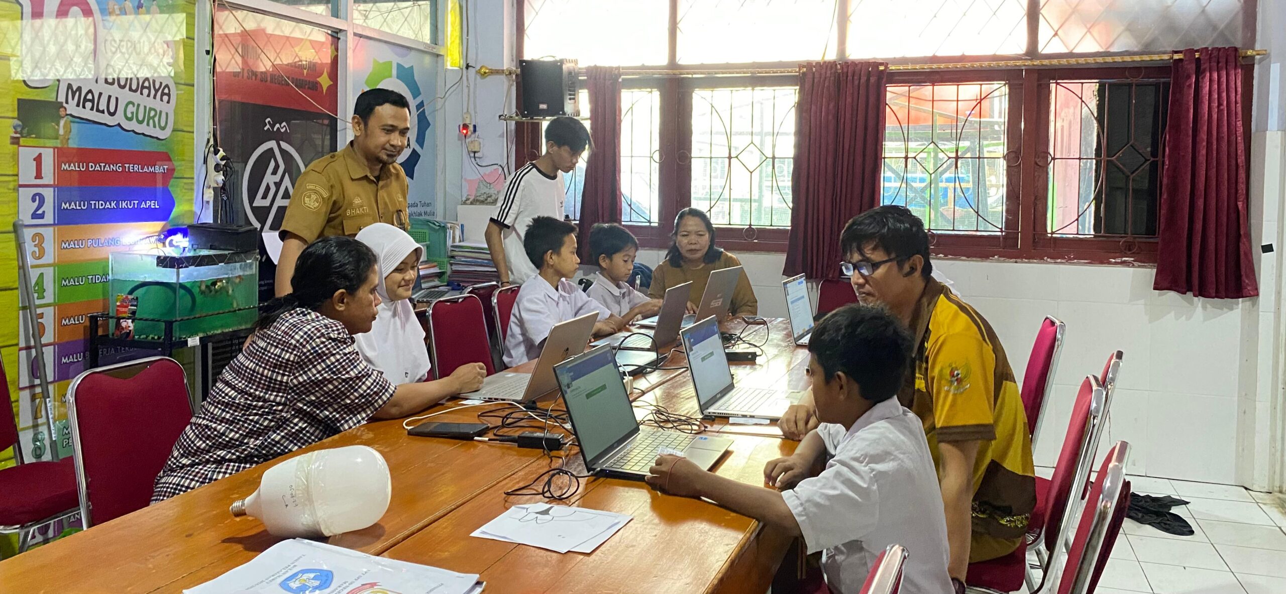 TargetNasional Online – Kepala UPT SPF SDN. Pampang Kec. Panakkukang Kota Makassar, Bhakti Pandi Hasin, S. Pd., memantau berjalannya pelaksanaan simulasi Tes Kemampuan Akademik yang berlangsung pada ruang guru.